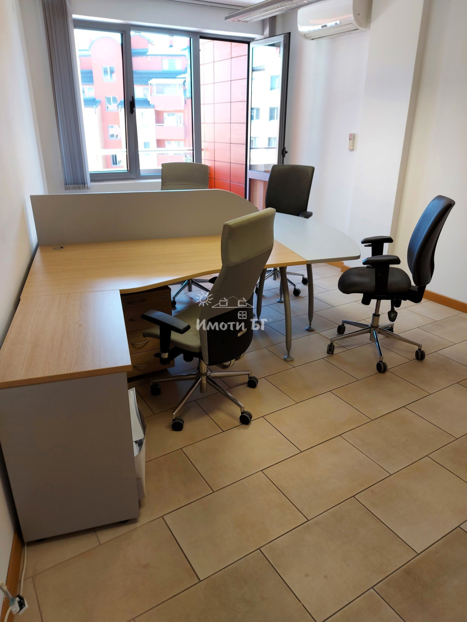 IMOTI BG offers a fully furnished office in a modern office building, situated on the corner of Simeonovsko Shosse Blvd. and Prof.Ivan Stranski Str.. The building is with a well-maintained common areas, security and elevator. Layout: the office space is functionally arranged and includes: entrance zone with a reception area, spacious meeting room, three separate office rooms, each with a balcony, fully equipped kitchenette, two service rooms. Technical characteristics: AC in each rooms, central heating, full cabling, access control system and videomonitoring, life security guard of the building. The office is modern and functional, fully equipped, suitable for a medium-sized team. Includes comfortable desks with enough cabinets and drawers for storage and organizing of documents. In front of the building there are stops of buses 102. 805 and 67, which provided fast connection with the Centre of Sofia and Metro stations 1 and 2. Garbage tax and maintenance fee are at the expense of the tenant. Maintenance fee - 170 EUR per month. Possibility to be rented and underground garage with a size of 24 sq.m. against an extra monthly rent of 110 EUR and maintenance fee of the garage of 120 EUR/year. Prices are excl. VAT.