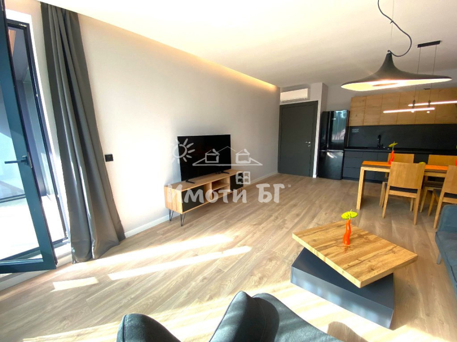 Imoti BG is pleased to offer a  NEW spacious one-bedroom apartment for rent. Perfect location - meters from Mall Sofia and metro station, 10 minutes walking distance from the Presidency.  The apartment is situated on the fourth floor in a luxury building - construction 2023. Distribution: entrance hall, spacious living room with kitchen and dining area, bedroom, bathroom with toilet and terrace. The apartment is bright, facing east. Heating / cooling by inverter air conditioners of high class. It is offered fully furnished and finished according to a design project. The entrance has access control and video intercoms. There is an option to rent an underground parking space. No pets allowed. Available from 27.10.2025. Viewings are possible by prior arrangement.