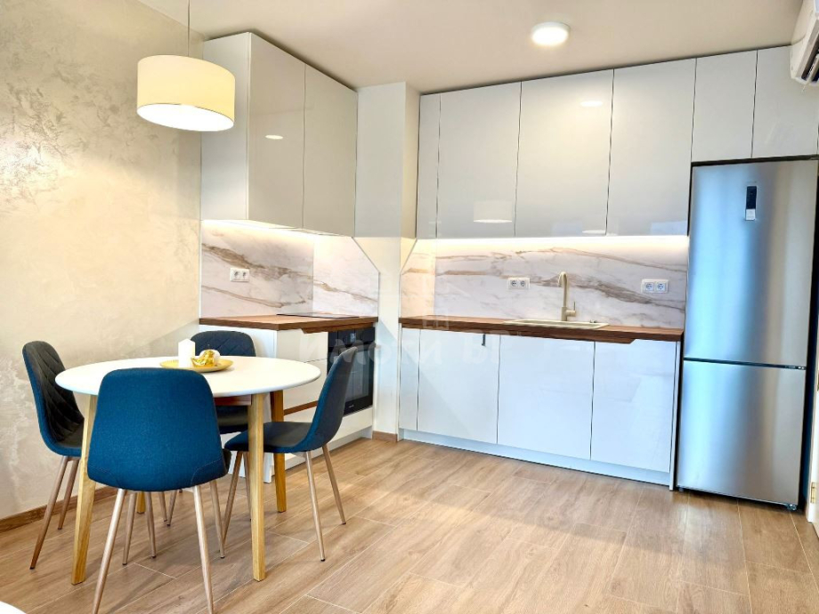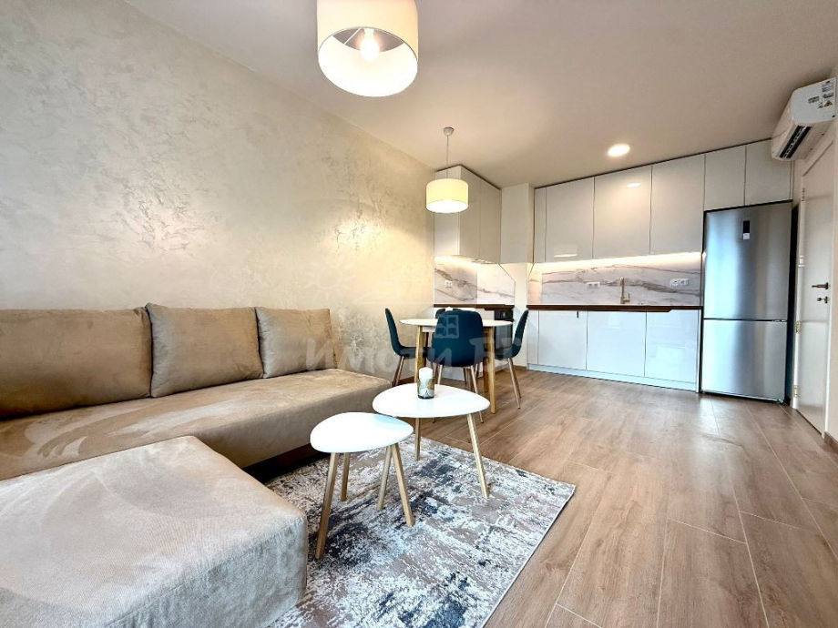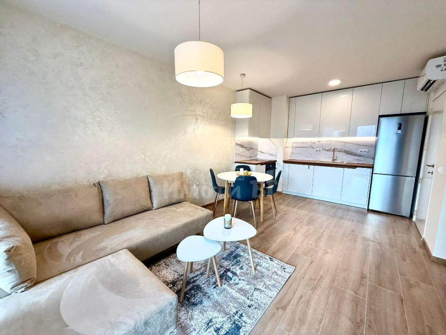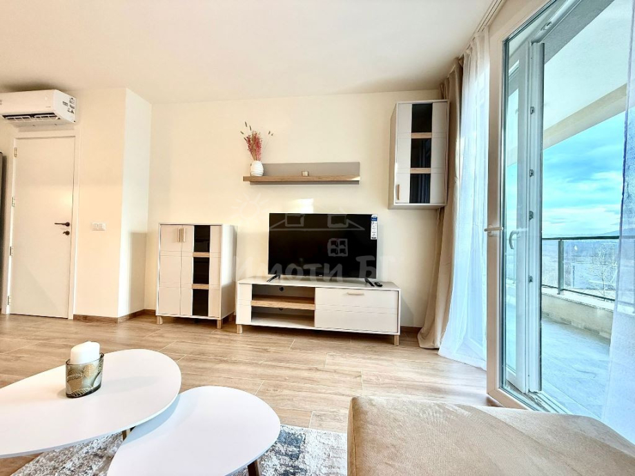 Разпределение: входно антре, хол с кухненски бокс и трапезария, спалня, баня с тоалетна и чудесна панорамна тераса. Предлага се изцяло обзаведен и завършен по дизайнерски проект, като на разположение на наемателите има: ПЕРАЛНЯ СЪС СУШИЛНЯ, кухня с вградени уреди, включително СЪДОМИЯЛНА МАШИНА, интелигентен бойлер, 2 климатика, ТЕЛЕВИЗОР 43', blackout пердета и др.