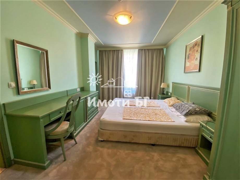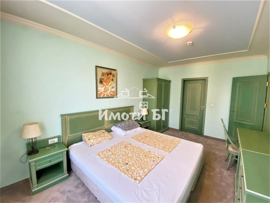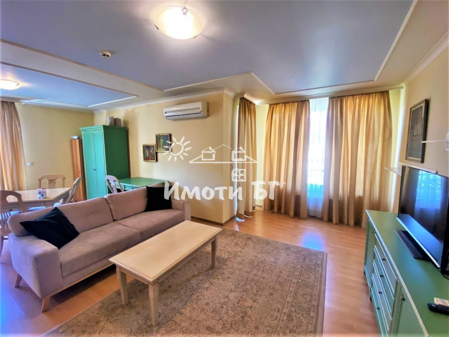 Разпределение: входно антре, обширен хол с кухня и трапезария, тераса, голяма спалня със собствена баня, отделна тоалетна за гости. Обзаведено и оборудвано с всичко необходимо. Отопление - чрез централна инсталация на газ, има и климатик.