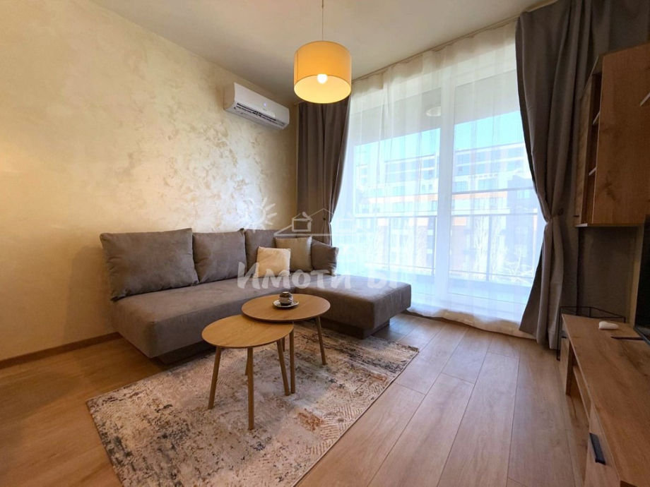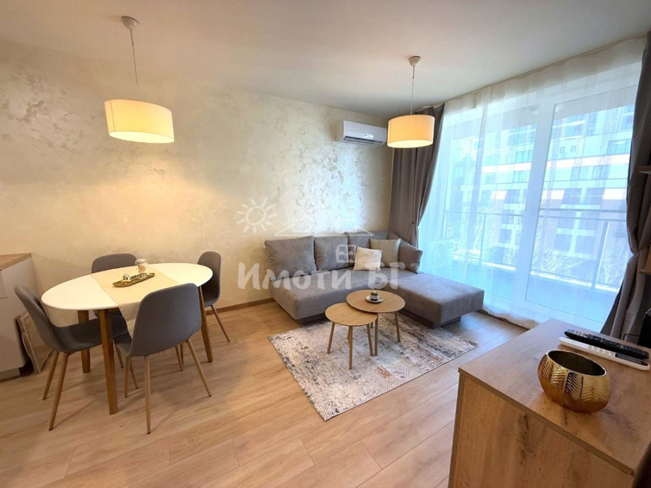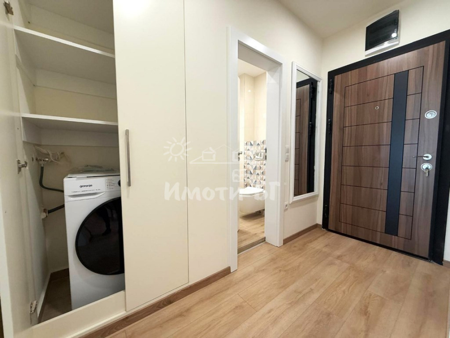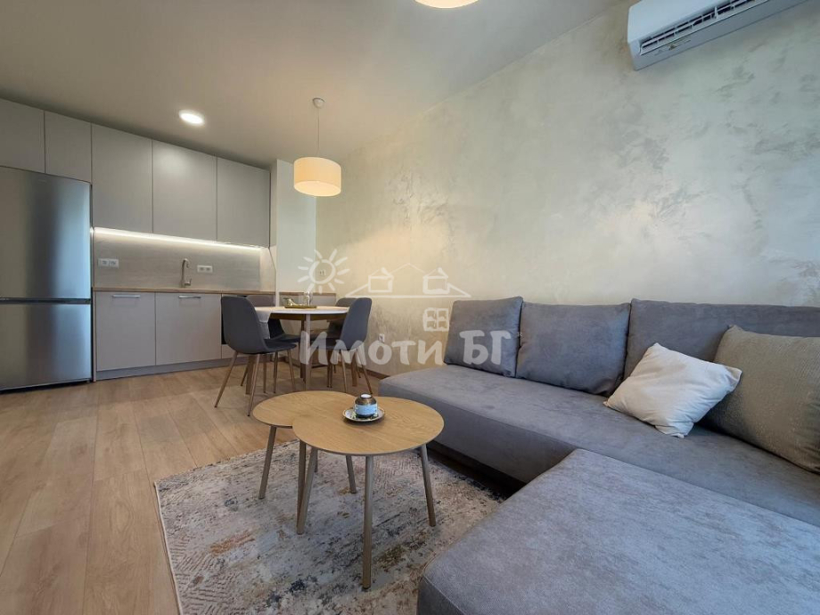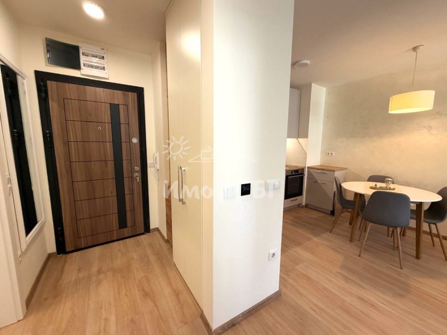Разпределение: входно антре, хол с кухненски бокс и трапезария, спалня, баня с тоалетна и тераса. Предлага се изцяло обзаведен и завършен по дизайнерски проект, като на разположение на наемателите има: ПЕРАЛНЯ СЪС СУШУЛНЯ, кухня с вградени уреди, включително СЪДОМИЯЛНА МАШИНА, интелигентно газово котле с WiFi и ПОДОВО ОТОПЛЕНИЕ, климатик с WiFi, 2 БРОЯ ТЕЛЕВИЗОРИ 43' (в хола и в спалнята), blackout пердета и др.