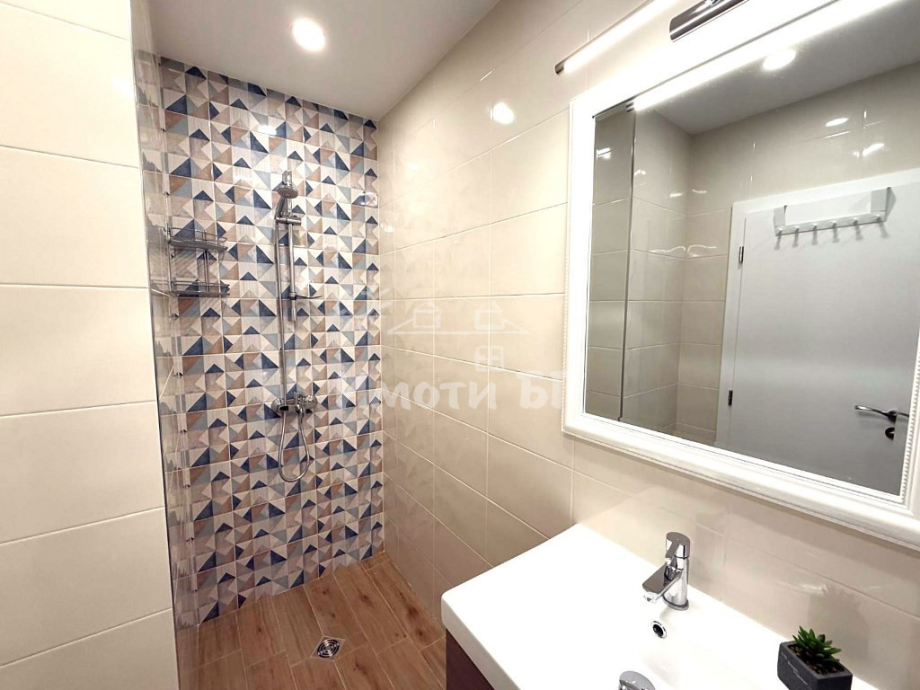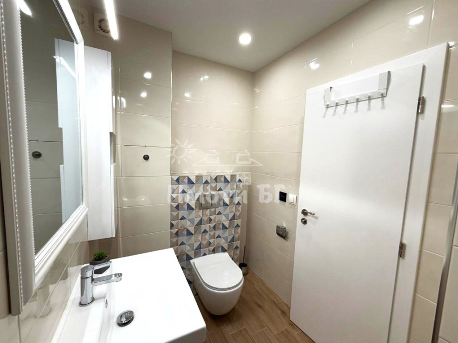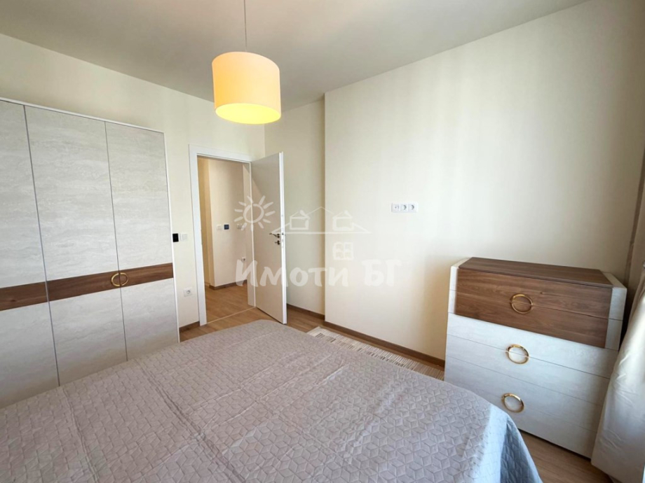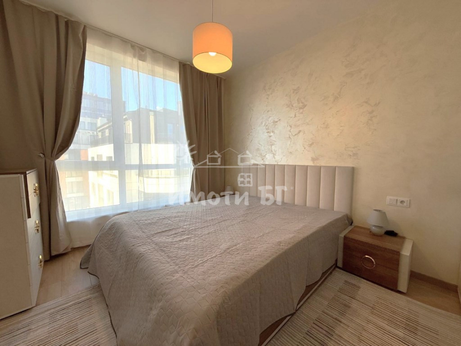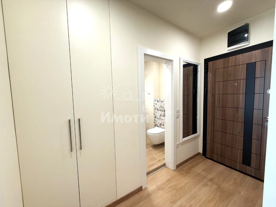 Разпределение: входно антре, хол с кухненски бокс и трапезария, спалня, баня с тоалетна и тераса. Предлага се изцяло обзаведен и завършен по дизайнерски проект, като на разположение на наемателите има: ПЕРАЛНЯ СЪС СУШУЛНЯ, кухня с вградени уреди, включително СЪДОМИЯЛНА МАШИНА, интелигентно газово котле с WiFi и ПОДОВО ОТОПЛЕНИЕ, климатик с WiFi, 2 БРОЯ ТЕЛЕВИЗОРИ 43' (в хола и в спалнята), blackout пердета и др.