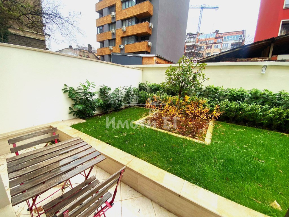 Уникален нов двустаен апартамент със собствена градина под наем. Усещане за живот в къща, в центъра на столицата. Жилището е изключително просторно и се състои от входно антре, кухня с трапезария, хол, спалня с дрешник, баня с тоалетна и собствен закътан вътрешен двор. Без никакви преминаващи коли или пешеходци около жилище. Напълно оборудван и обзаведен с внимание и към най-малкия детайл. Всички стаи са големи и светли. Апартаментът е изцяло вътрешен, със западно изложение. Отоплението е чрез централен ТЕЦ, има и климатици.