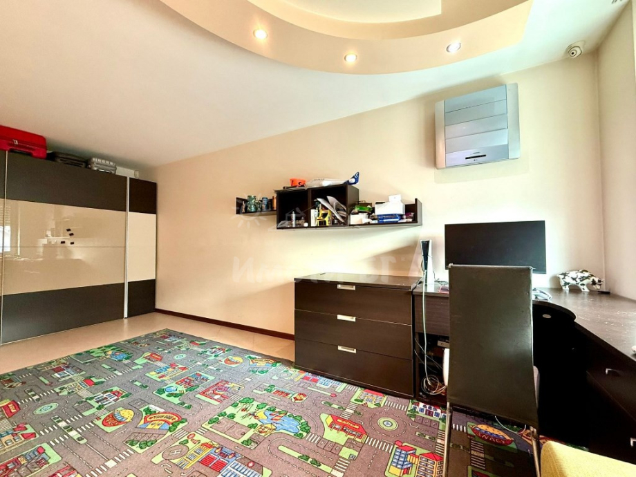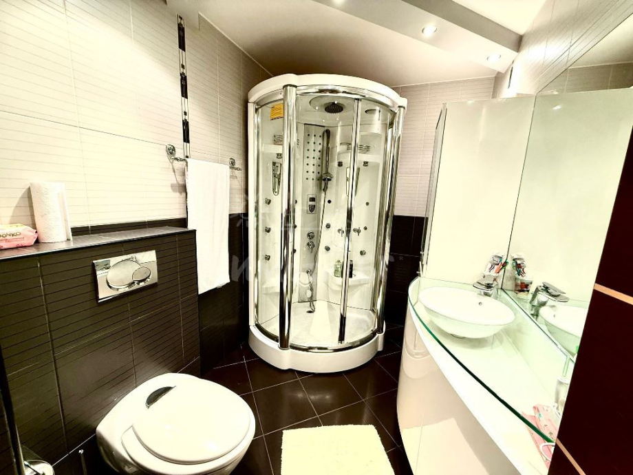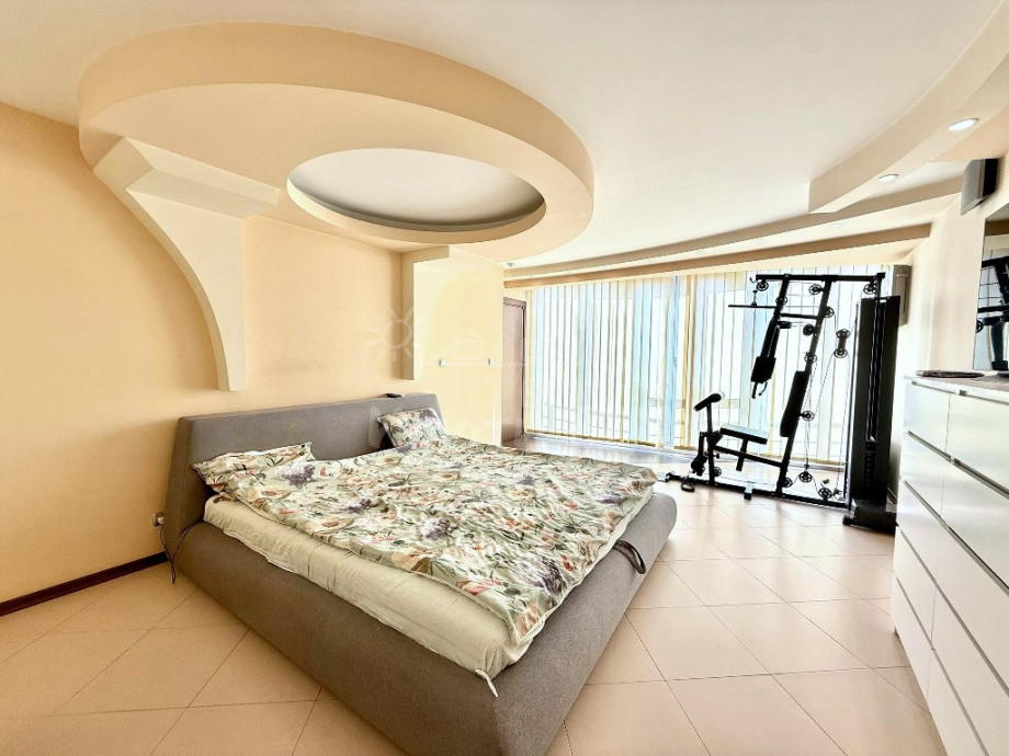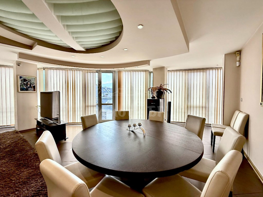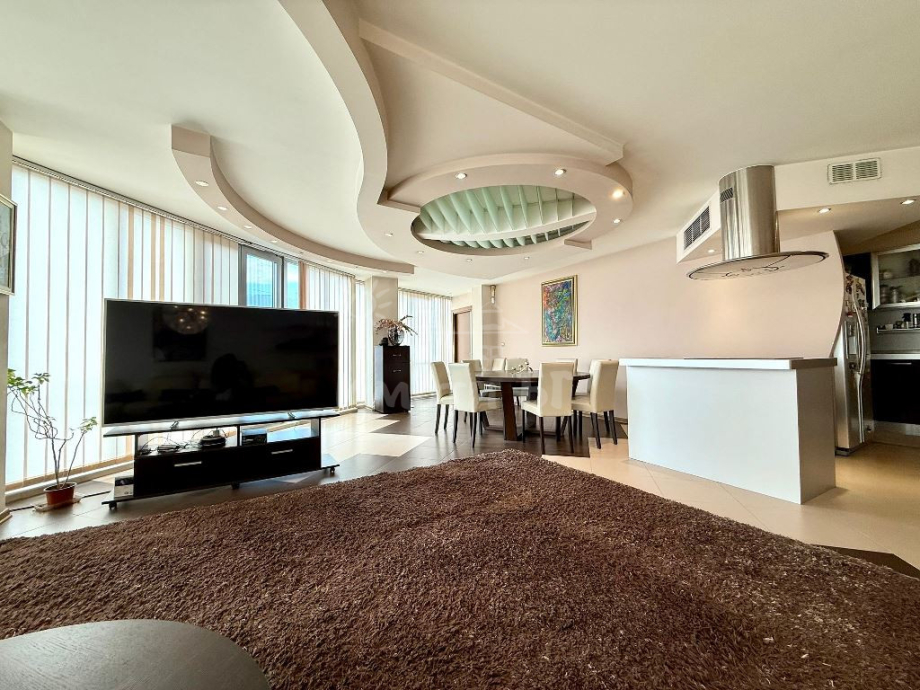 Апартаментът е изключително просторен и функционално разпределен и се състои от: входно антре, обширен хол с кухня и трапезария (60 кв.м.), родителска спалня със собствена баня с хидромасажна вана и дрешник, втора спалня с големи размери, втора баня с тоалетна. Апартаментът е напълно обзаведен и оборудван с всичко необходимо, има окабеляване за интернет, СОТ система. Разполага с централно подово отопление, обуславящо комфорт през зимата, има и климатици.