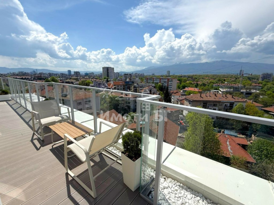 Предлага се напълно обзаведен, включително: пералня със сушилня; в баните: ROCA японски тоалетни чинии с подгряване и биде функции; големи шкафове, скрито осветление, интелигентни вентилатори PAX с автоматично регулиране на оборотите, GROHE душ пити и душове; поръчкова кухня с вградени електроуреди, преместваем бар - остров; 50" телевизор с подвижна стенна стойка; диван с подвижни части за релакс и удобство; портманто и голям шкаф за обувки; спалните разполагат с поръчкови високи гардероби с вградено осветление и огледални врати и големи легла. Тераса с озеленяване с изградено капково напояване, зана за барбекю, мивка, кът с мебел за релакс и кът с мебели за кафе с гледка на Витоша и града;
