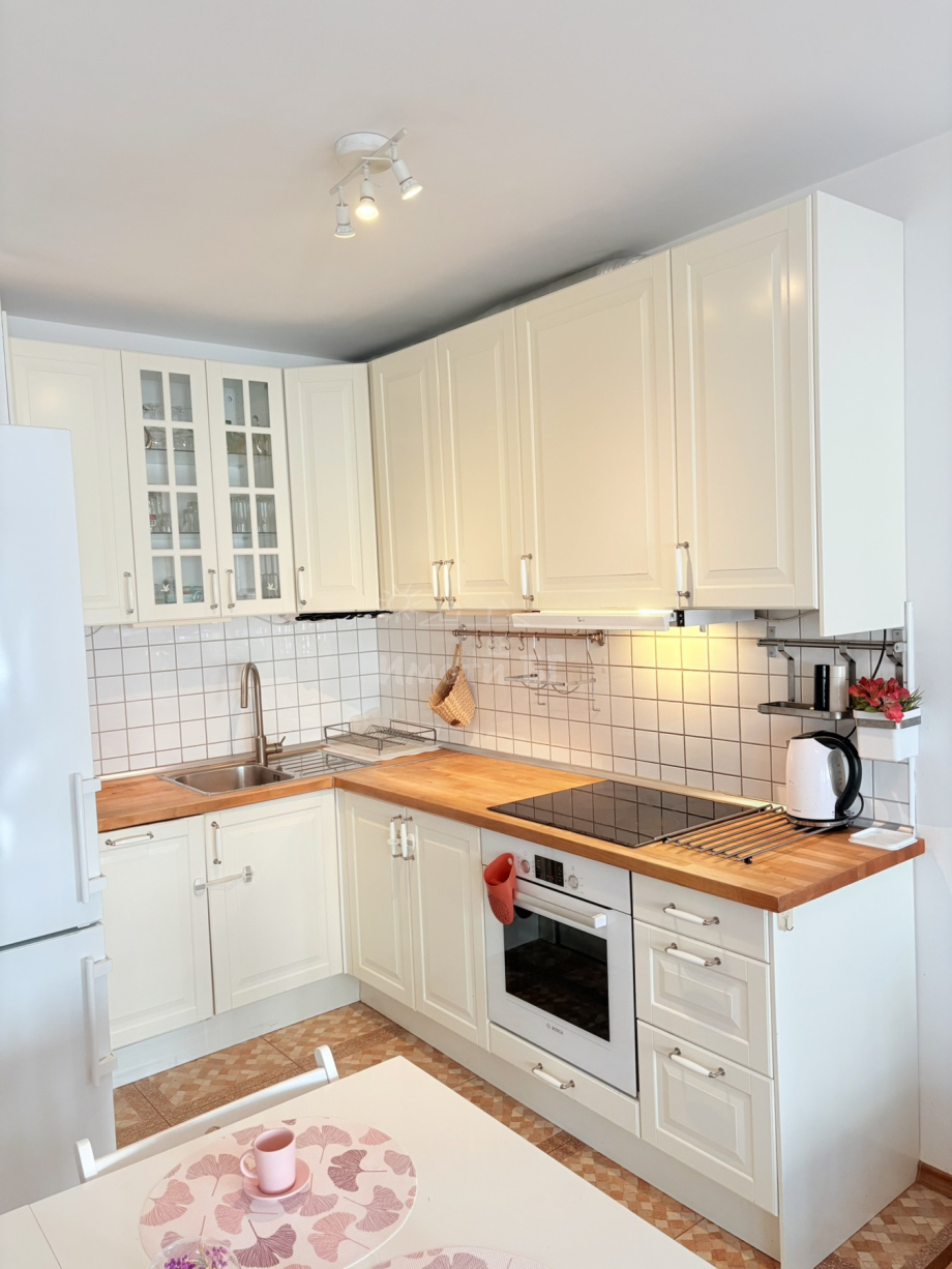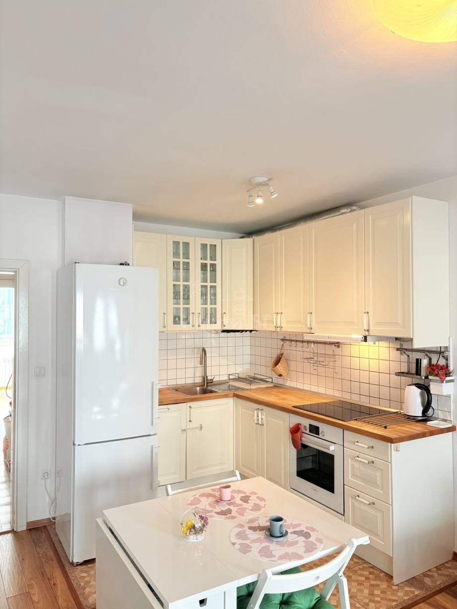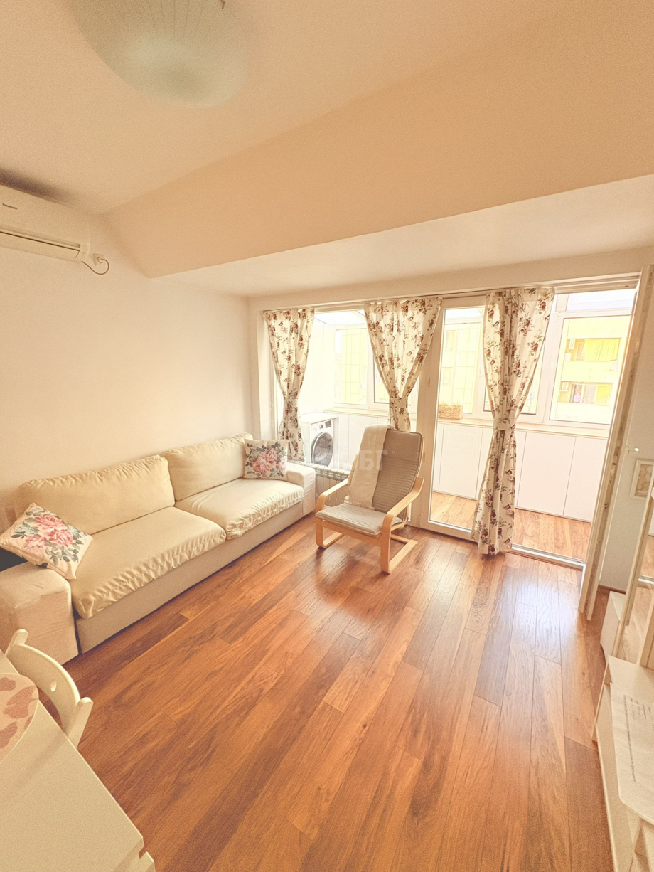 ИМОТИ БГ предлага напълно и модерно обзаведен тристаен апартамент с отлично местоположение - непосредствено до МОЛ България, БИЛЛА, трамвайни и автобусни спирки. Апартаментът е в сграда от 2004 година с ограничен достъп, асансьор и отлично поддържани общи части. Разпределение: входно антре, хол с кухненски бокс и зимна градина, две спални /едната обзаведена със спален комплект, другата като детска стая с легло тип сандвич и гардероб + балкон с прекрасна гледка към Витоша/, баня с тоалетна, тоалетна, тераса. Жилището е изключително светло и уютно и е напълно обзаведено с всичко необходимо за живеене. Отопление на ТЕЦ + климатици в дневната и родителската спалня. Подови настилки: ламиниран паркет в стаите, гранитогрес в сервизните помещения. Ниски консумативни разходи и такса поддръжка. Свободен за наемане веднага! КЛЮЧ в агенцията!