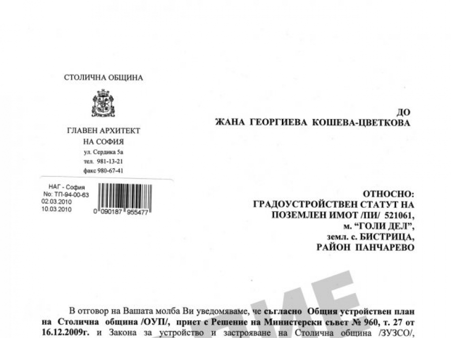 парцел 1500 кв.м. в началото на Бистрица в местността 'Голи дел' (София) (VIP зона) разрешено застрояване. КИНТ 0.6, Плътност на застрояване 25%. 41м лице на път, Равен, геоложки доклад В съседство - Ново ниско строителство, Единствен собственик. разкошна панорама към Витоша.